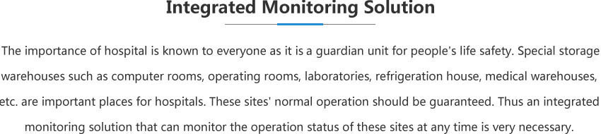 The importance of hospital is known to everyone as it isa guardian unit for people’slife safety.Special storage warehouses such as computer rooms, operating rooms, laboratories, refrigerationhouse, medical warehouses, etc. are importantplacesfor hospitals. These sites’ normal operationshould be guaranteed.Thus an integrated monitoring solution that can monitor the operation status of these sites at any timeis very necessary.